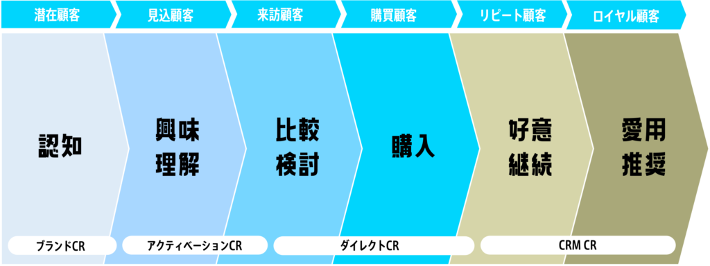 一過性の企画制作ではなく、得意先の課題に対してブランド領域から見直して戦略を構築し、ダイレクト領域にて優良な顧客を効率的に獲得し、CRM領域にてロイヤル顧客へと育てていくクリエイティブ施策を実行。3つの領域にて得意先の事業全般を長期的に伴走サポートしていきます。